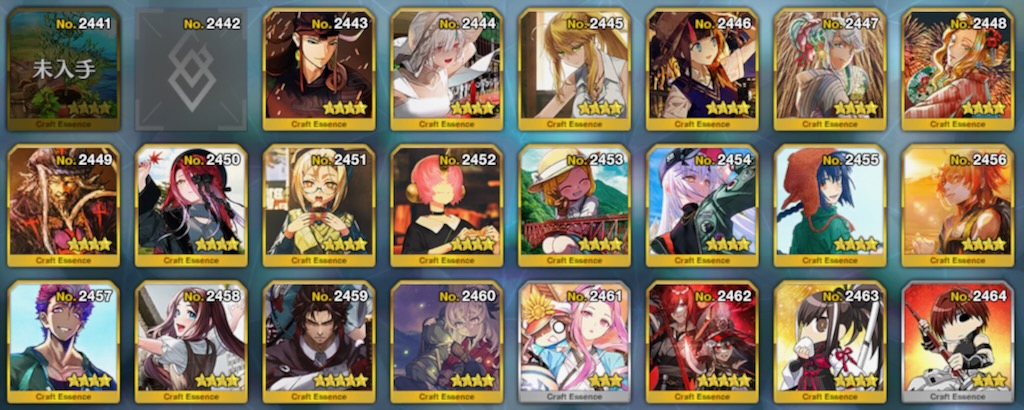 No.2443からNo.2458までがOVER THE SAME SKY -SEPTEMBER-ピックアップ対象で、ようやく本日揃えることができた。一日一回召喚と数日前に44連、そして本日44連、最後は交換券でNo.2446のエリセを交換。こういう記念礼装は集めておきたいからねぇ・・・。